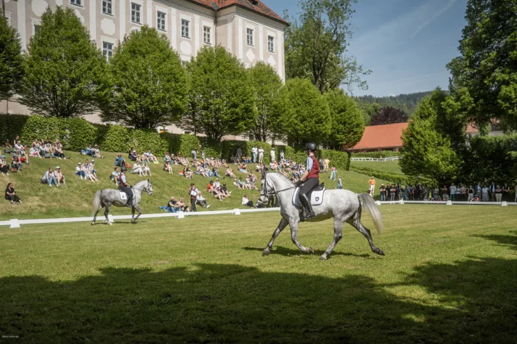 Our interactive experience pop-ups across the stud grounds will answer all your questions: Why is there a dedicated open-stable system? Which stallions of the Spanish Riding School are stationed at Piber for the breeding season? Which Lipizzaners are currently available for purchase? Which imperial dignitaries once traveled in the magnificent carriages displayed in our carriage museum? And what makes the interior of Baroque Schloss Piber so impressive?
